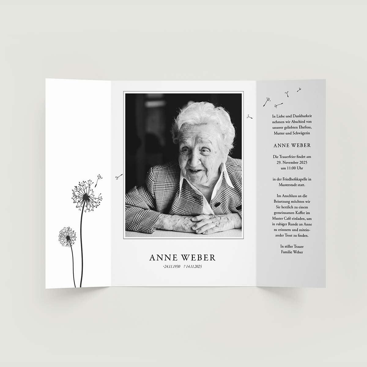 Diese Trauereinladung im Altarfalz wird mit einer zarten Schleife veredelt und einfühlsam nach Ihren persönlichen Wünschen gestaltet. Texte, Farben und Details passen wir individuell für Sie an – sorgfältig und respektvoll umgesetzt von unserem erfahrenen Grafikteam. So entsteht eine würdevolle Einladung, die Ihre Anteilnahme stilvoll zum Ausdruck bringt.